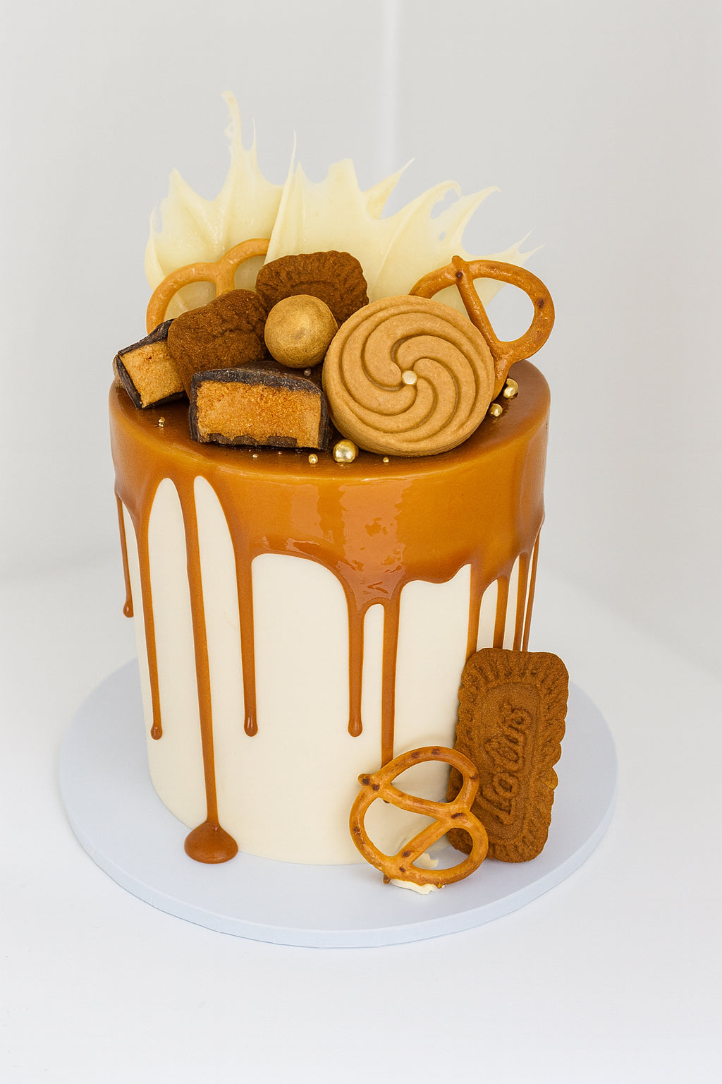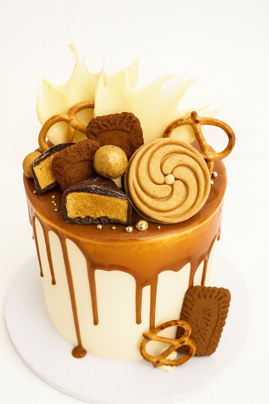 Caramel Lover Cake decoration is covered in silky Swiss meringue buttercream, drizzled with authentic dulce de leche, and topped with white chocolate, Maltesers, Melting Moments, Biscoff, and honeycomb. A sweet and indulgent choice for caramel fans.