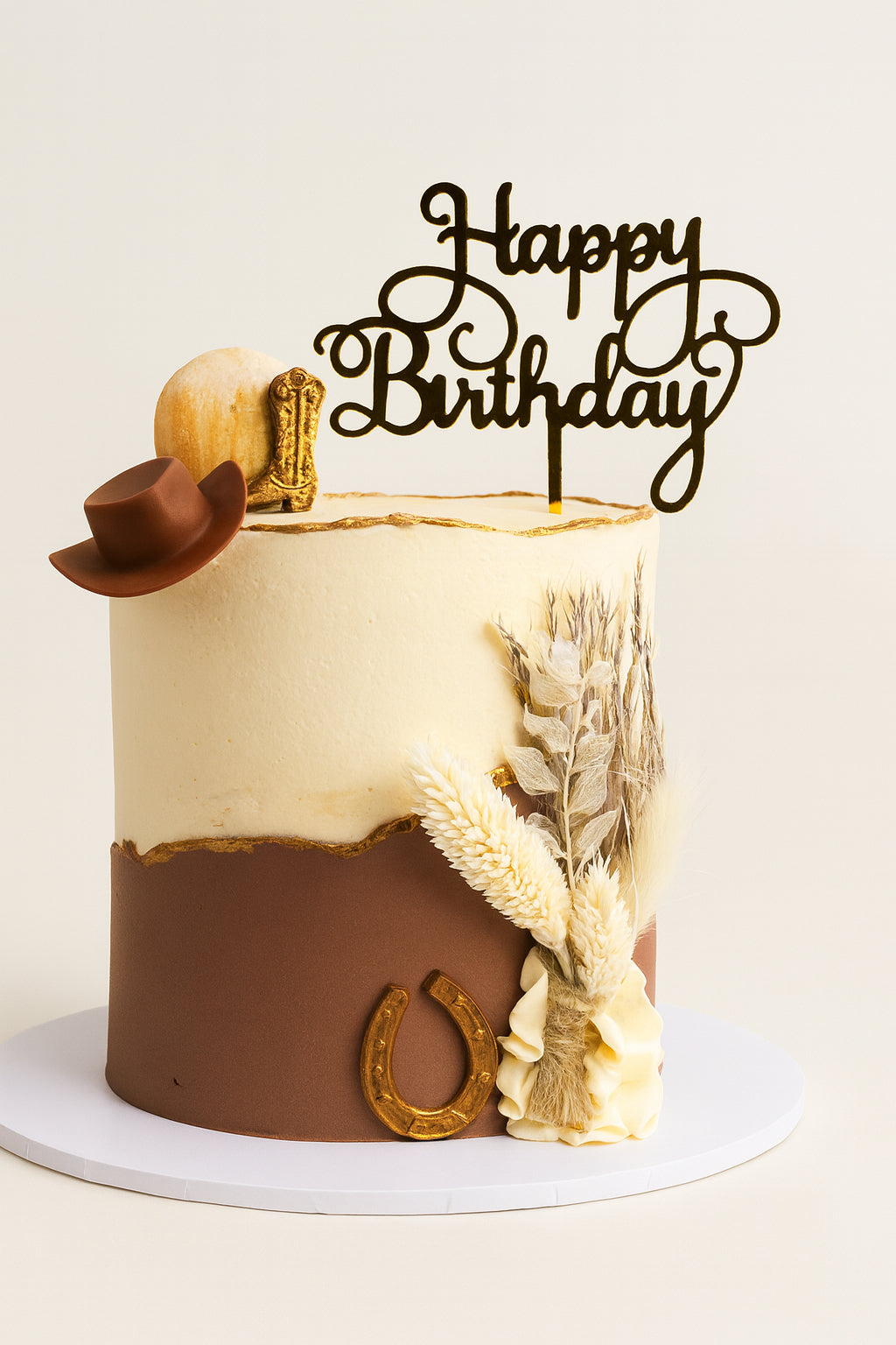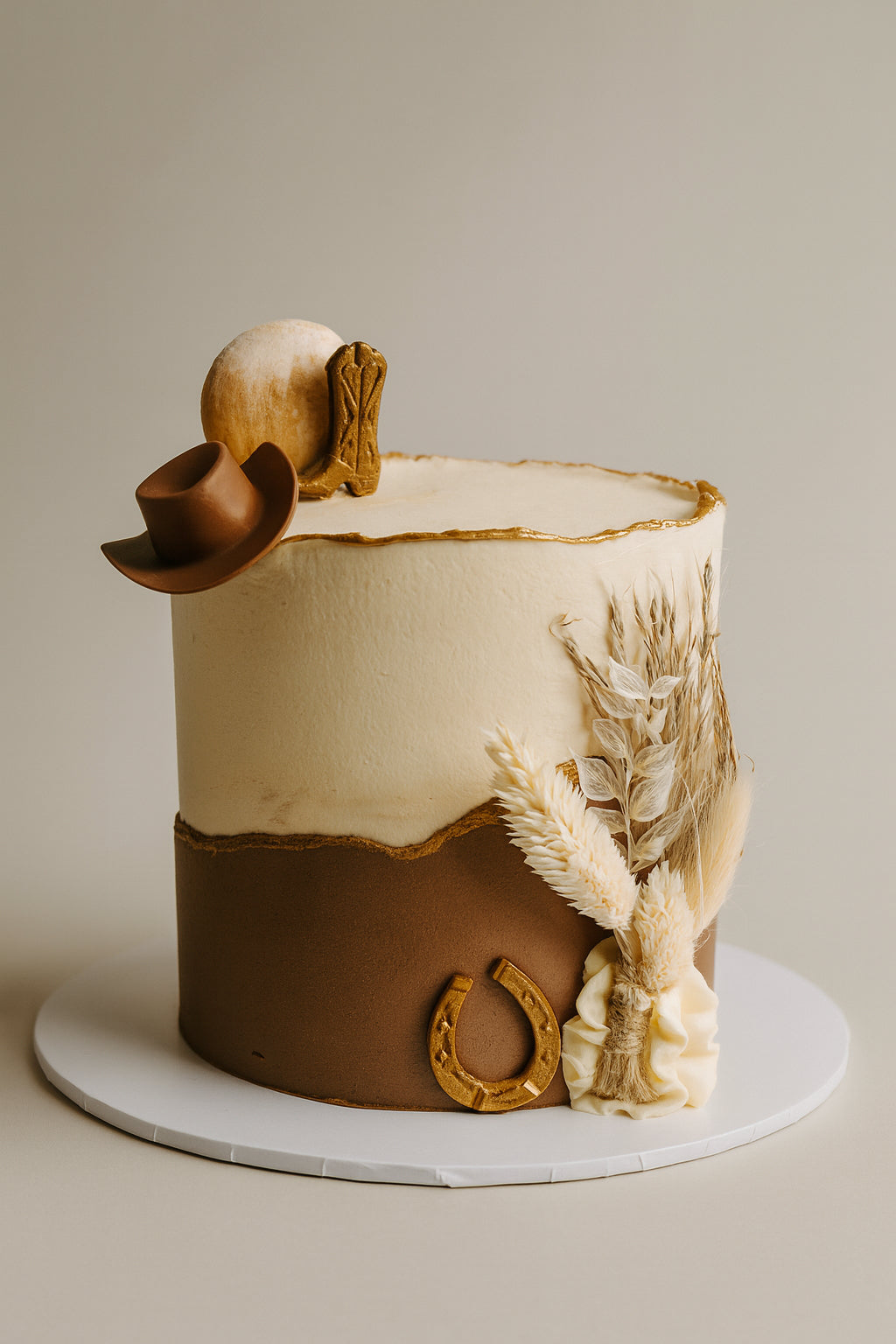 A beautiful white and brown buttercream cake with golden country details that make it look rustic and elegant at the same time. This cake is perfect for anyone who loves country music, western style, and sweet rustic vibes.
