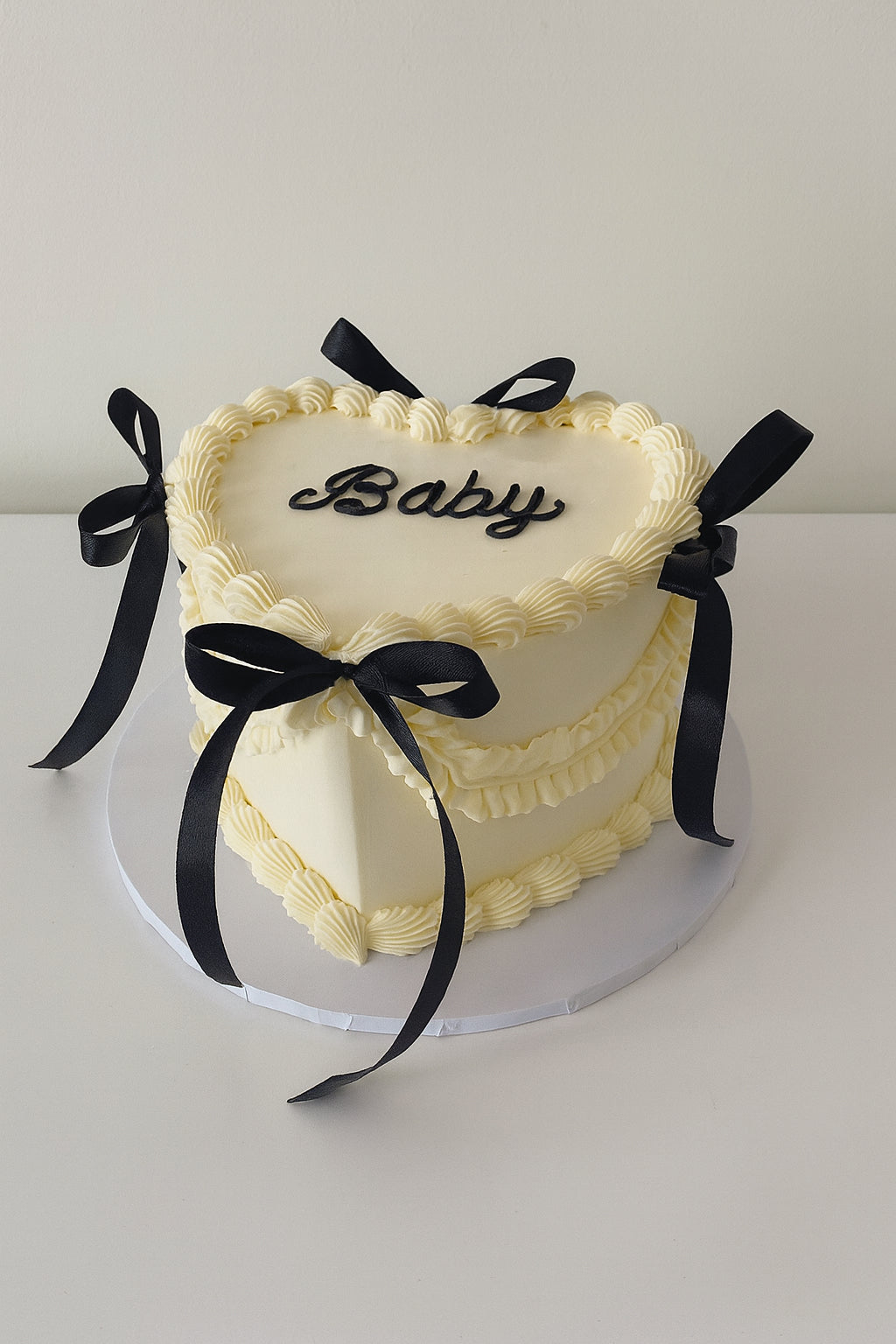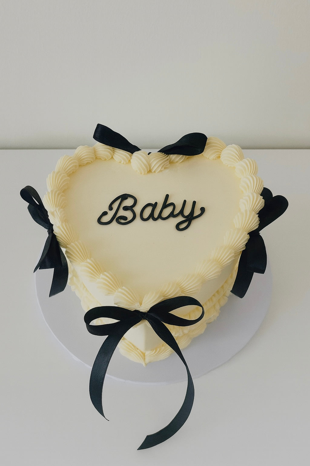 Mini Gender Reveal Cake comes in a charming heart shape, frosted in smooth white buttercream with a vintage-inspired design. Finished with elegant black bows and the word “Baby” on top, this 5-inch cake serves 6 to 8 people — a perfect centerpiece for celebrating such a special moment.
