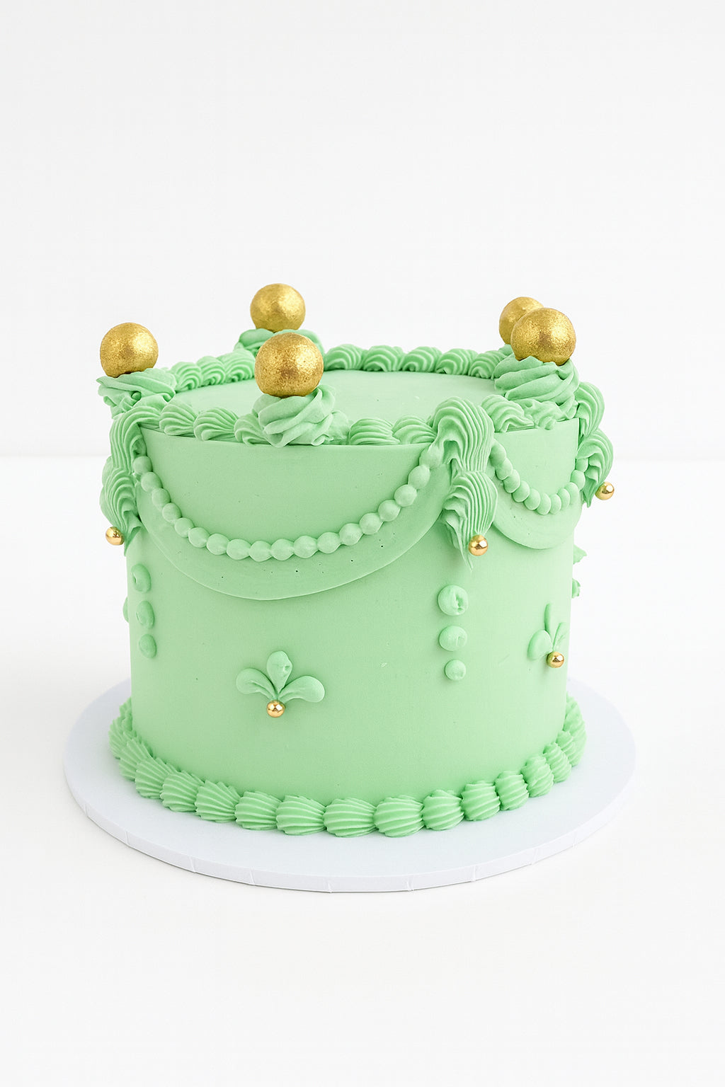 The Vintage Cake brings a fresh twist to the classic design — more modern and clean, yet still carrying the timeless elegance and luxury of vintage style. Available in 4 soft colours — mint, peach, pink and white — each cake is finished with delicate golden details that make it truly special.
