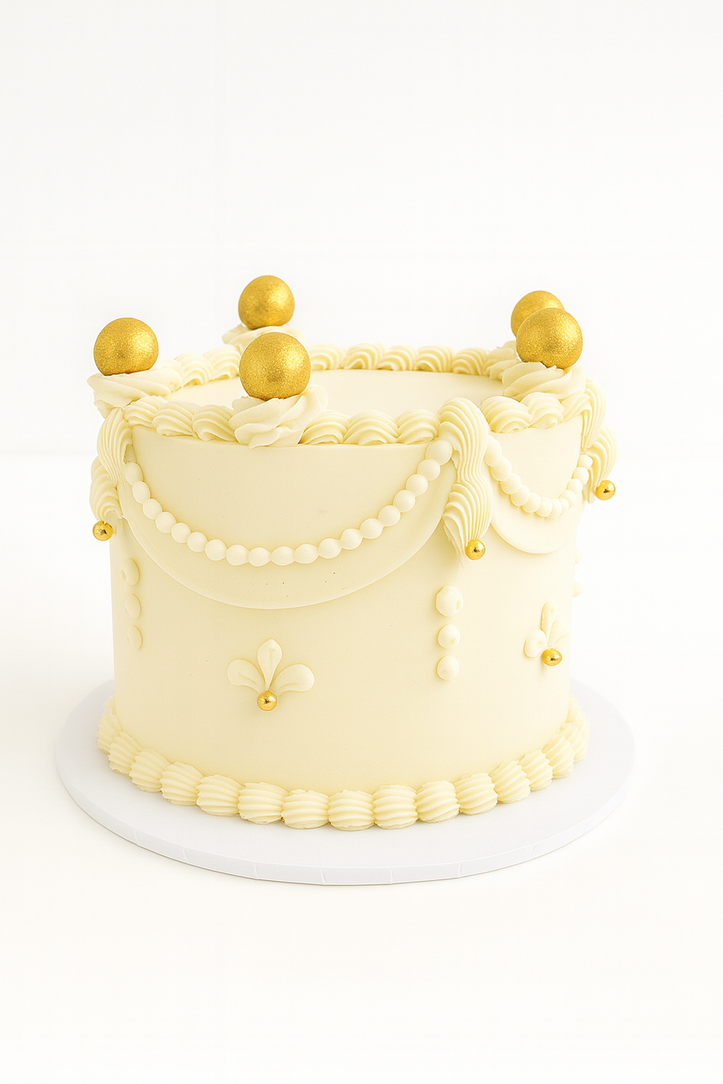 The Vintage Cake brings a fresh twist to the classic design — more modern and clean, yet still carrying the timeless elegance and luxury of vintage style. Available in 4 soft colours — mint, peach, pink and white — each cake is finished with delicate golden details that make it truly special.